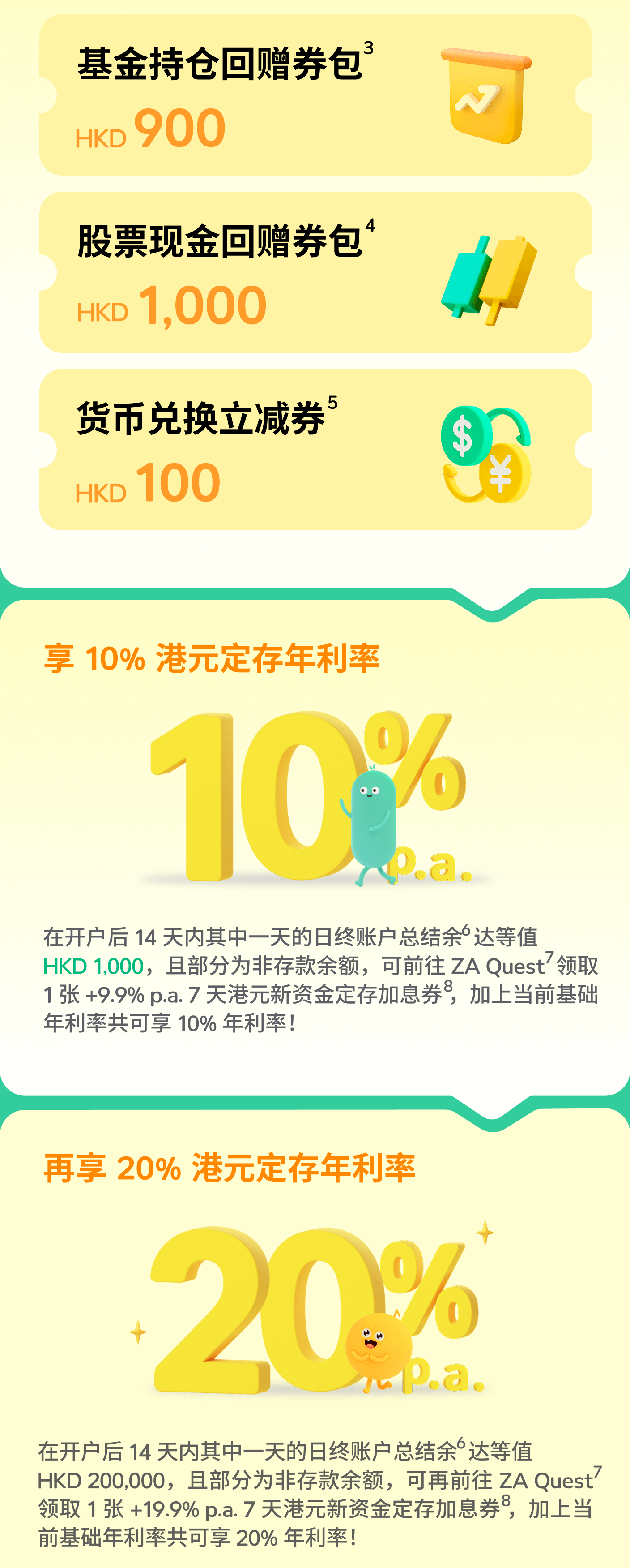 众安银行,内地人或者香港人,只要在香港,都可以下载众安银行App自助开户了。 填写邀请码 M8G753 ,成功在港开户后可获得 1 张 4.39% p.a. 港元定存加息券,加上基本年利率2.21% p.a. 客户可享高达 6.6% p.a. 的 3 个月港元定期存款年利率,可享高达 HKD 800 利息。 众安银行有限公司获授权于香港特别行政区从事银行业务及受规管活动,并受香港法规所规管,为香港居民及访港旅客提供的产品及服务,满足用户在港消费、理财等真实金融需求。 本行仅能在香港境内为持有效证件的人士提供开户服务,在申请本行账户时,客户必须要身处香港境内的主要城区内。 立即开户 https://l.za.group/DaSy5